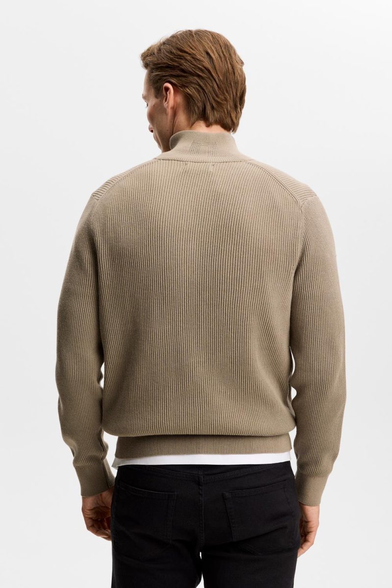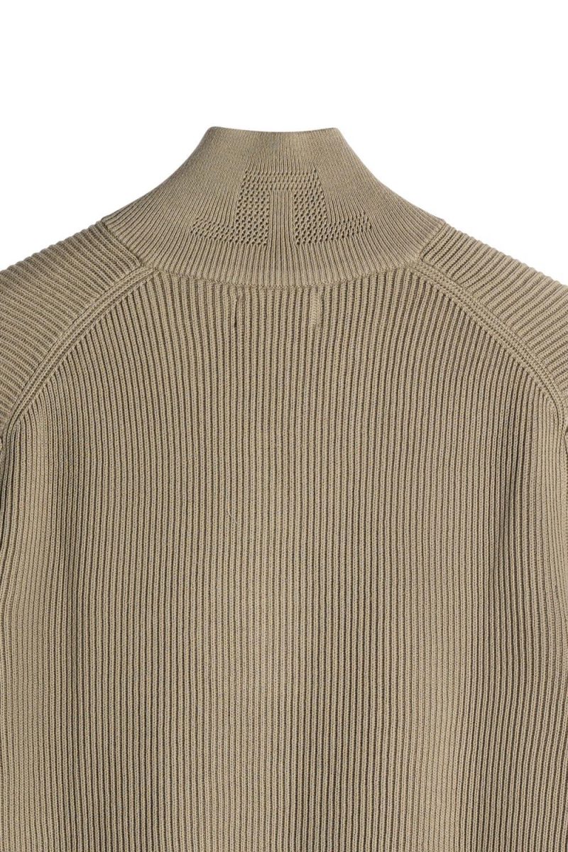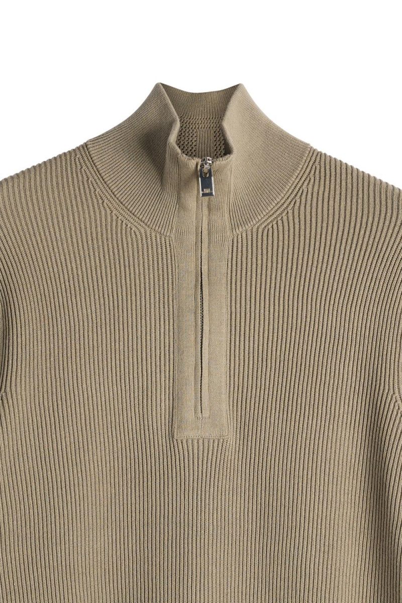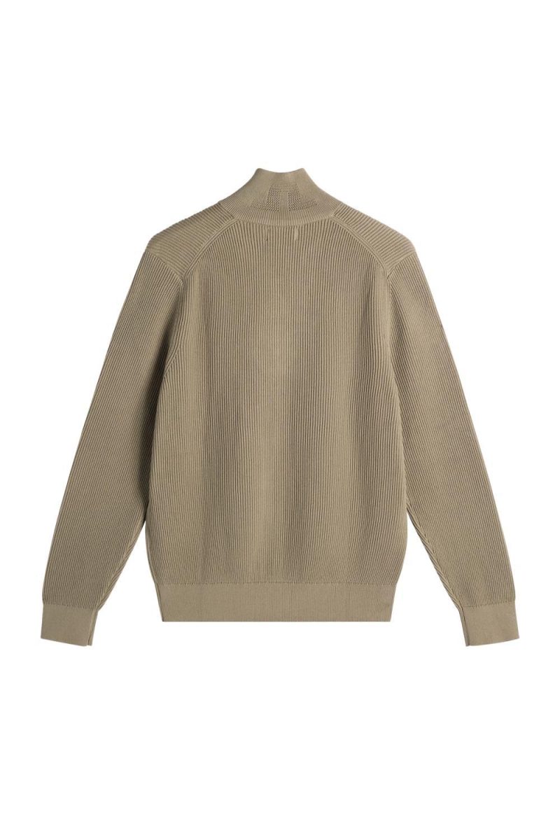 Strikket half zip genser i bomull fra J.Lindeberg. Genseren har glidelås ved halsen med høy hals, man finner også fine detaljer som ribbestrikket tekstur og finere ribbestrikk ved hals, håndledd og midje.