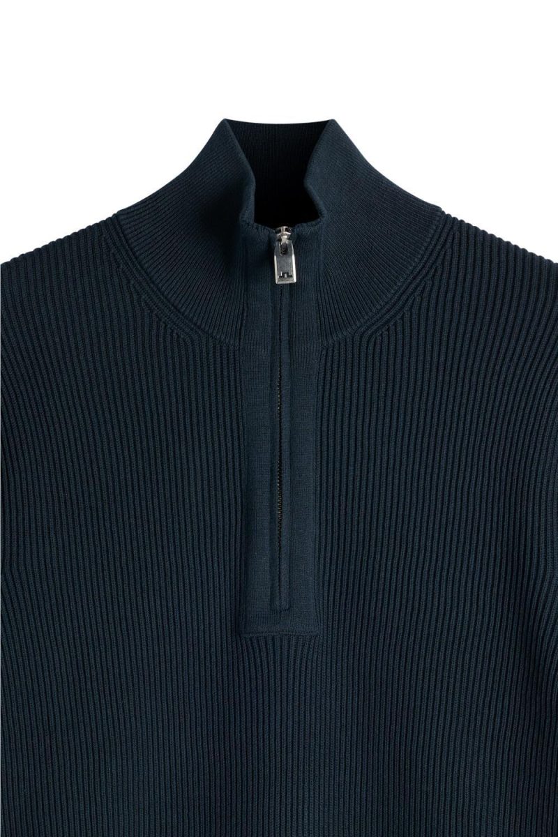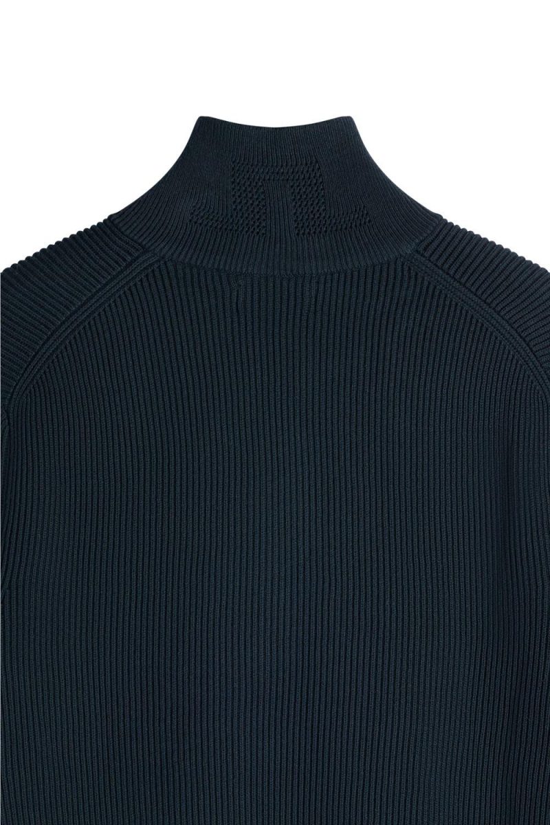 Strikket half zip genser i bomull fra J.Lindeberg. Genseren har glidelås ved halsen med høy hals, man finner også fine detaljer som ribbestrikket tekstur og finere ribbestrikk ved hals, håndledd og midje.