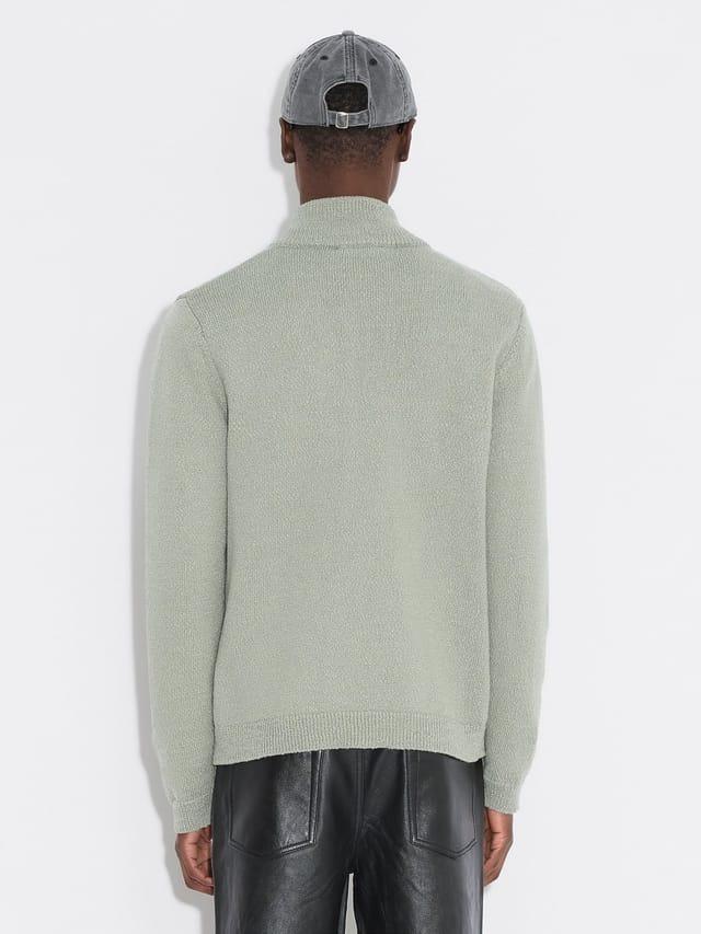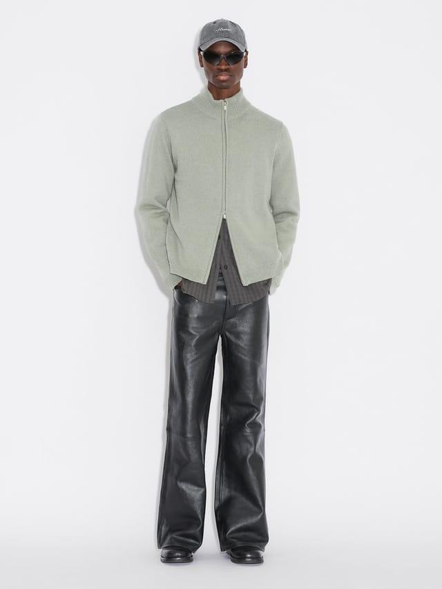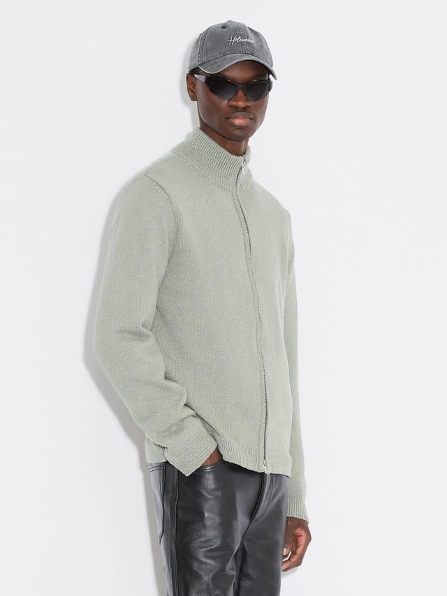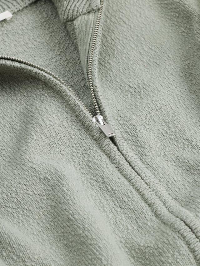 Strikket full zip genser i bomull og merinoull fra Holzweiler. Genseren har toveis glidelås med høy hals, man finner også fine detaljer som fin tekstur og ribbestrikk ved hals, håndledd og midje.