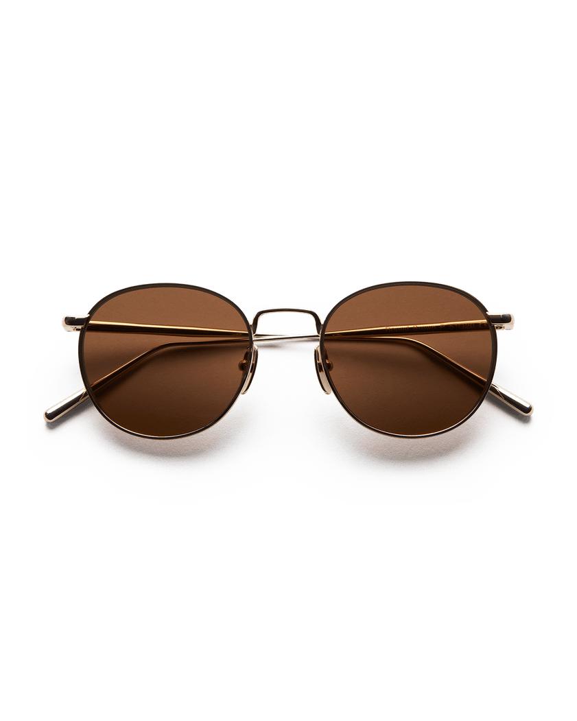 Denne bueformede innfatning danner den perfekte myke og runde formen. Innfatningen er håndlaget av rustfritt stål i dempet gullfarge, og har en polarisert brun linse.