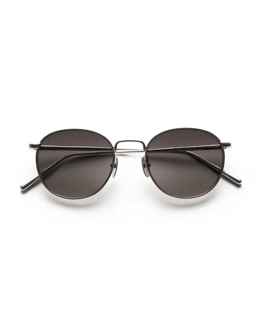 Denne bueformede innfatning danner den perfekte myke og runde formen. Innfatningen er håndlaget av sølvfarget rustfritt stål, og har en polarisert grå linse.