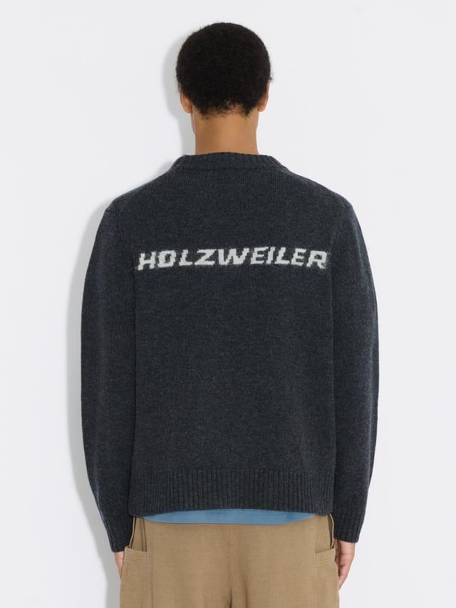 Strikket genser fra Holzweiler. Genseren har rund hals og strikket logo motiv på ryggen. Genseren er laget av ull og ribbestrikk ved hals, håndledd og midje.