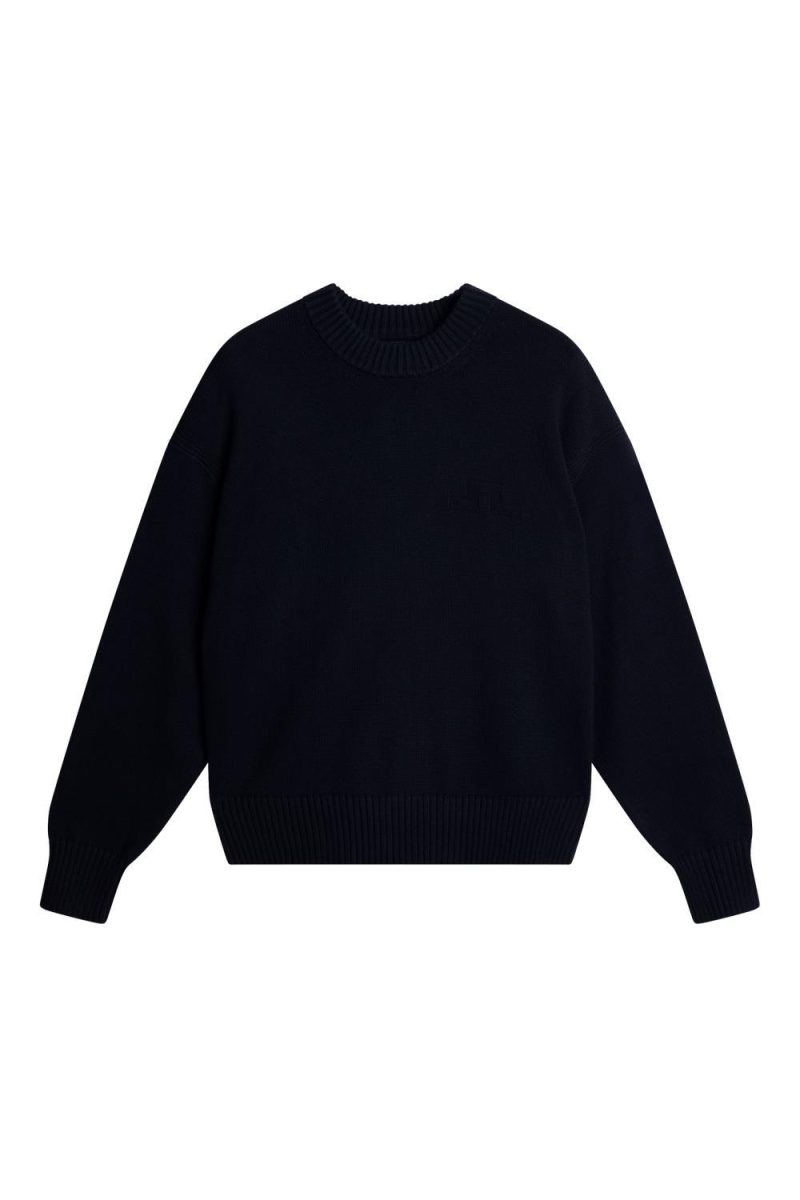 Strikket genser i ull/bomull fra J.Lindeberg. Genseren har fine detaljer som kraftig ribbestrikk ved hals, midje og håndledd samt brodert ton-i-ton «JL» logo på brystet.