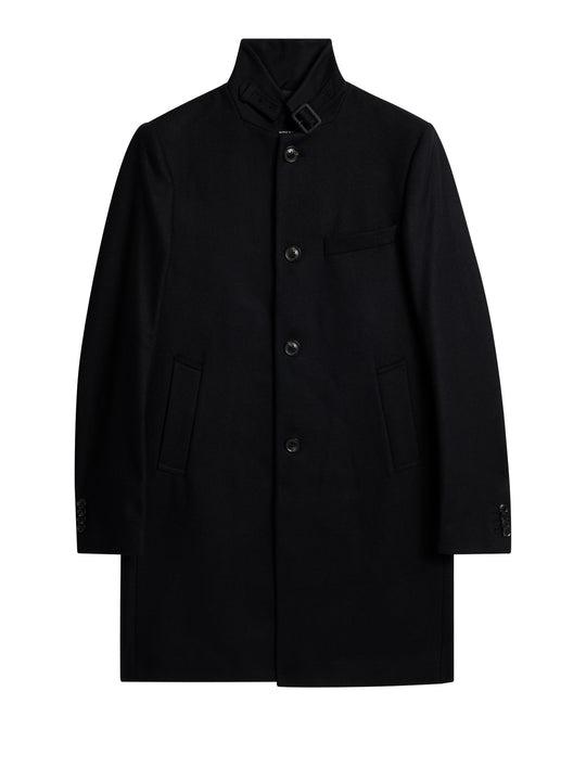 Ullfrakk fra J.Lindeberg. Frakken har stående krage med lukkemekanisme, Skråstilte sidelommer og en smal passform. Laget en kompakt og resirkulert ullblanding fra det italienske veveriet In.Tes.Pra.