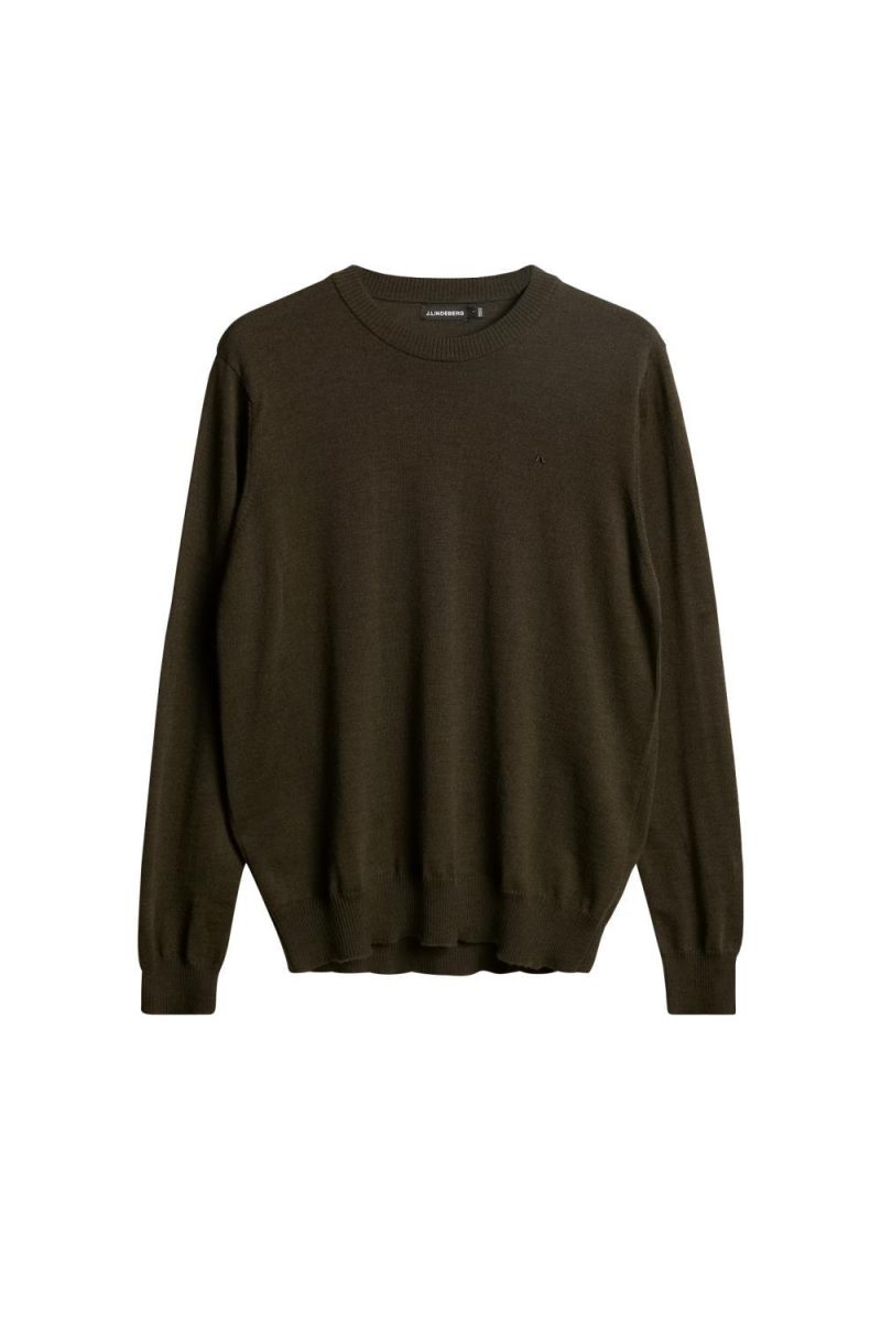 Finstrikket genser med rund hals i merinoull. Liten logo ved brystet og ribbestrikk ved hals, bunnen av genseren og ermene.