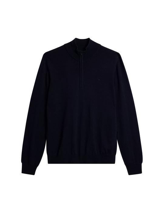 Finstrikket genser i merinoull med glidelås i halsen. Liten logo ved brystet og ribbestrikk ved halsen, midjen, og håndleddene.