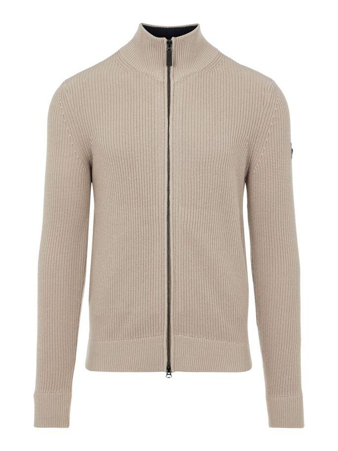 Tykk strikket cardigan med glidelås i merinoullblanding fra J.Lindeberg. Cardiganen har t-veis glidelås, to sidelommer med glidelås og «J.Lindeberg» patch logo på den ene armen.