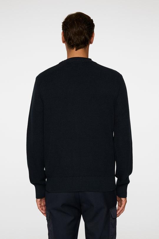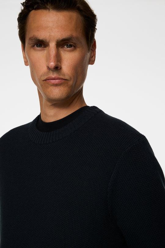 Strikket genser i bomull fra J.Lindeberg. Genseren er strikket med en fin tekstur og har fine detaljer som liten logo ved sidesømmen og ribbestrikk ved hals, håndledd og midje.