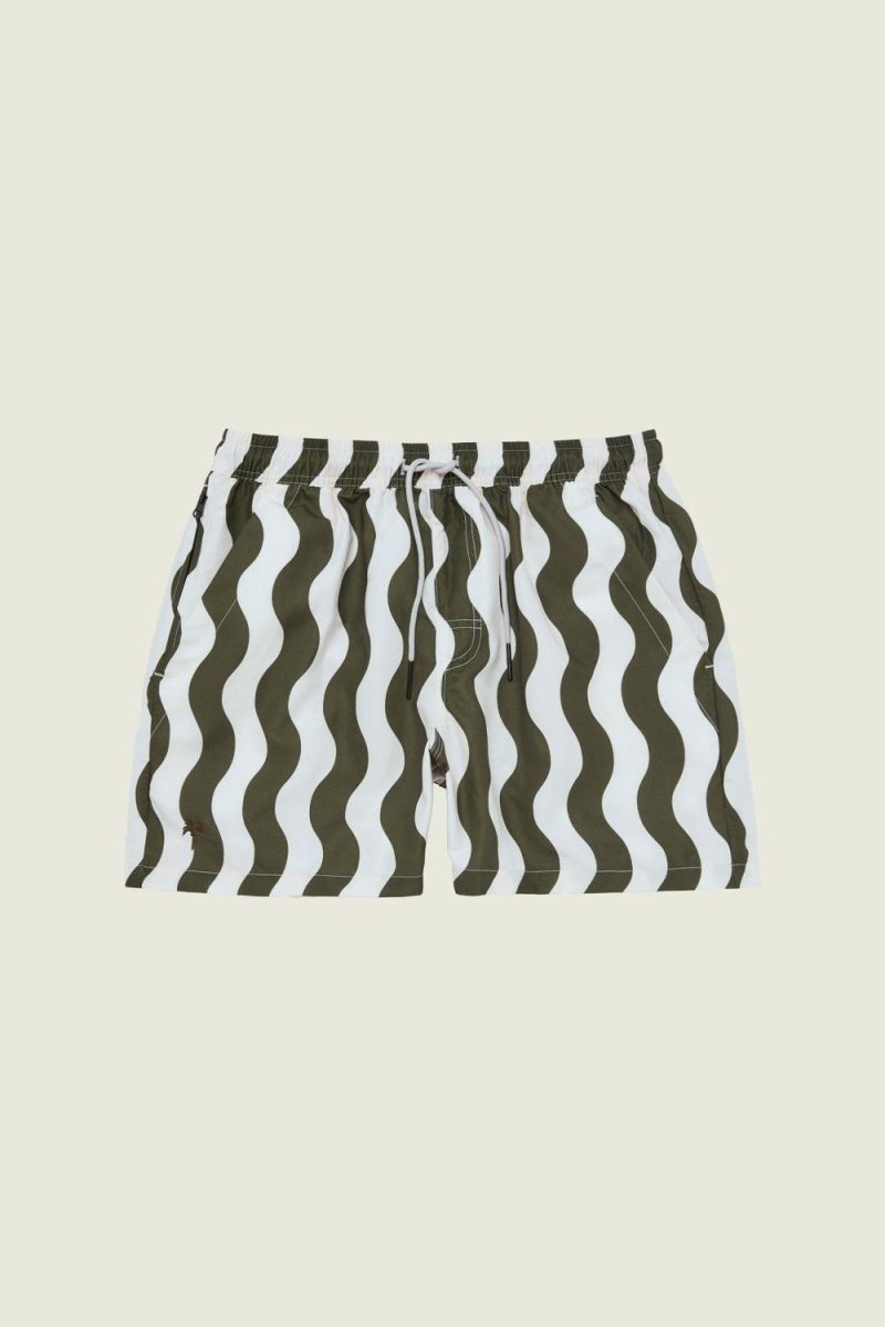 Badeshorts fra OAS. Badeshortsen er laget av et hurtigtørkende materiale og har to skråstilte sidelommer, en baklomme og en lomme på siden med glidelås.
