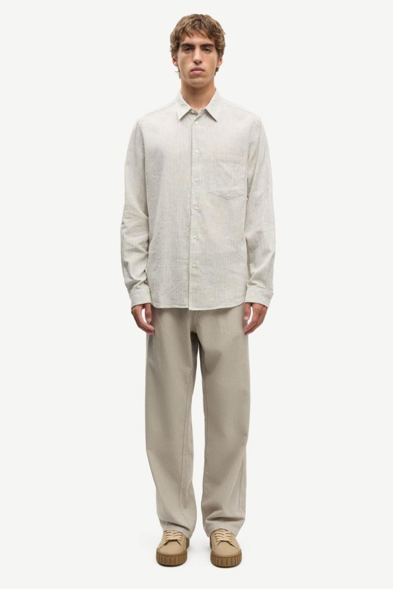 Myk og luftig skjorte i lin og bomull fra Samsøe Samsøe. Skjorten har fine striper, klassisk krage, to knapper ved mansjetten, brystlomme og en liten påsydd logo på siden.