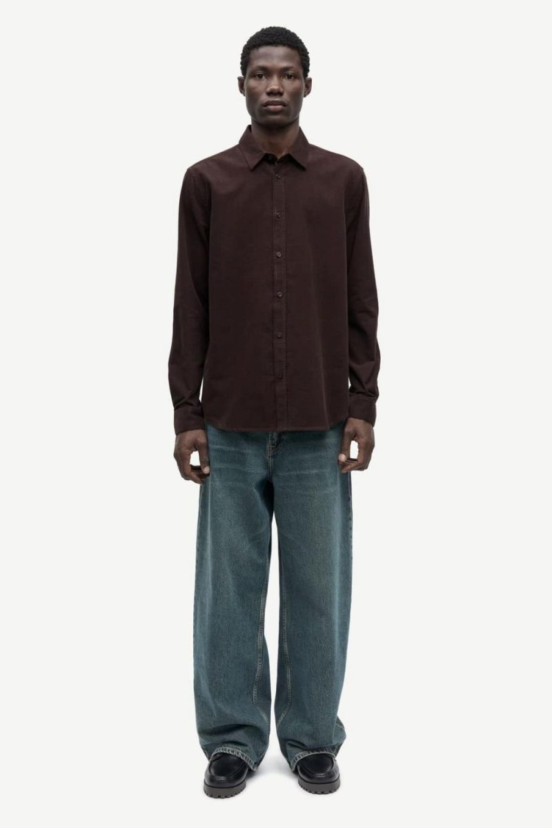 Myk og stilren skjorte i kordfløyel fra Samsøe Samsøe. Skjorten har klassisk krage, to knapper ved mansjetten og en liten påsydd logo på siden.