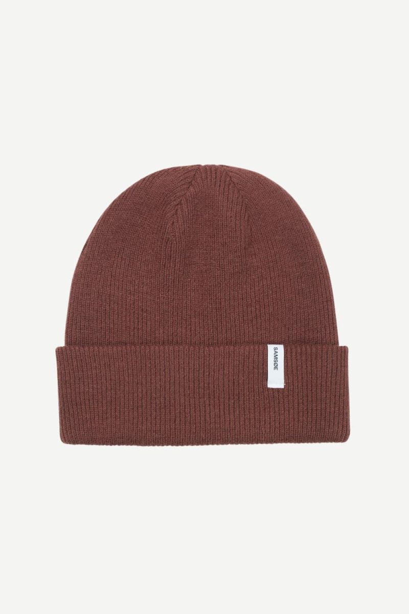 Lue fra Samsøe Samsøe med strikket struktur, liten Samsøe Samsøe-logo på siden.