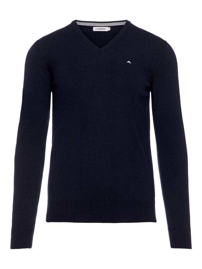 Finstrikket genser med v-hals i merinoull. Liten logo ved brystet og ribbestrikk ved bunnen av genseren og ermene.